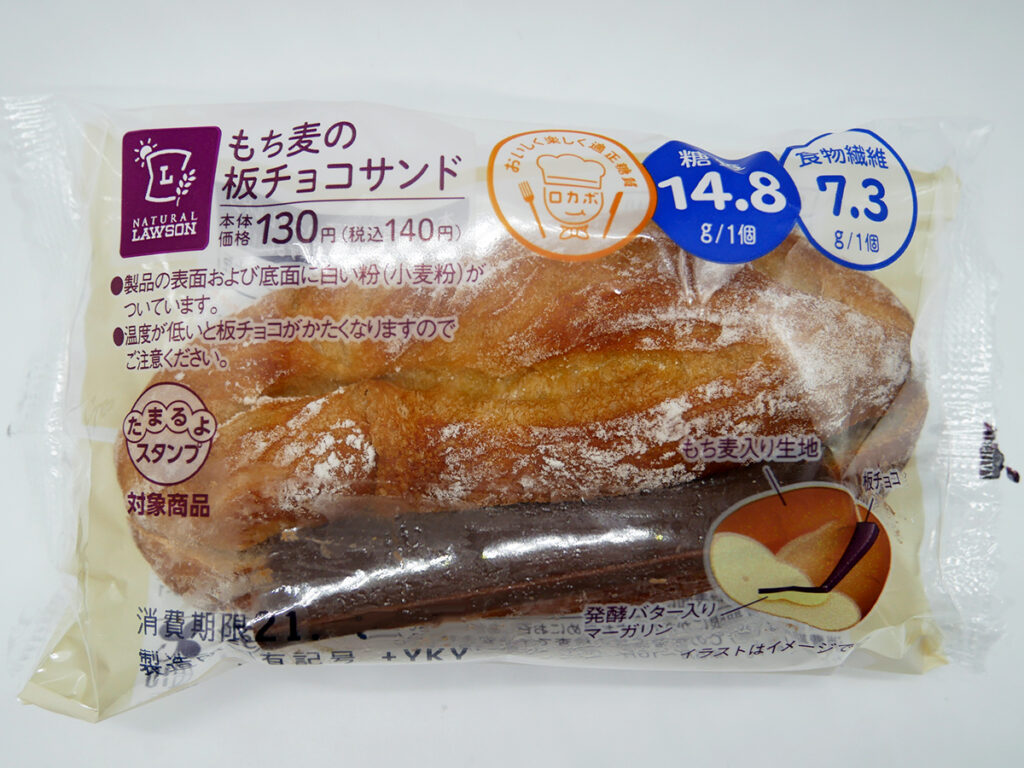 ローソンのもち麦の板チョコサンドの紹介。ローソン売りのヤマザキ製。小麦粉に加え大豆粉やもち麦粉由来の香ばしさとやわむっちり感が心地よい生地に、板チョコがドーンとサンド。コクのあるバター入りマーガリンも入りやや塩っぱめで甘いチョコとのバランスも良し。