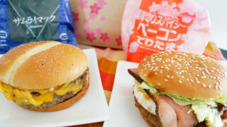 マクドナルドの人気ハンバーガー、新サムライマック。唐辛子のスパイシーさがきいた旨辛ダブル肉厚ビーフ、燻しがきいた燻製風マヨトリプルベーコン肉厚ビーフ、どちらも100%ビーフのパティが肉々しく食べ応えもバッチリ!同じく期間限定の黒胡椒ガーリックチキンナゲット&ソースも合わせてどうぞ!