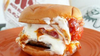 マクドナルドの人気のハンバーガーが復活しレギュラーメニューに加わったサムライマック<醤油風ダブル肉厚ビーフ>の紹介。ふっくらバンズに、つなぎ不使用ビーフ100%のパティ2枚、スライスオニオン、チェダーチーズ2枚のボリューミィさが魅力的。