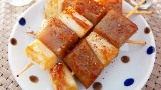 家計にも優しく、体に良く、ダイエットの見方でもある万能こんにゃくで焼き鳥のねぎま風。食べやすい大きさに切ったこんにゃくと白ネギを串に刺して焼くだけ。味付けは焼肉のたれで失敗もなし。ボリュームがあるけどヘルシーなので、ダイエット中や遅く帰った日の晩酌にもピッタリです。