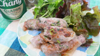 ひき肉にたっぷりのパクチーを混ぜ、ライスペーパーで包み焼いたソーセージ風に仕上げたおつまみレシピ。ナンプラーとパクチーが香るアジアンな味わいに、パリッとプルンッとライスペーパーの食感もたのしい一品です。タイやアジアのビールの用意もお忘れなく!