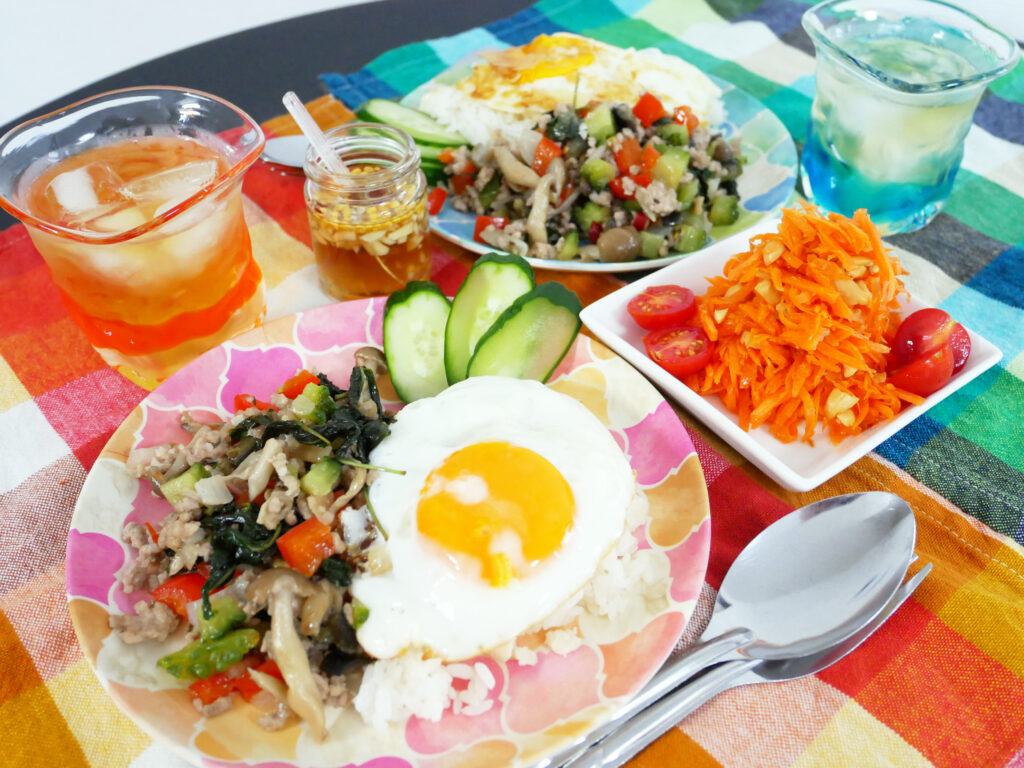 タイ料理の定番ガパオ。ガパオ=バジルなので、バジルと炒めればなんでもOK。残り野菜もたっぷり入れてヘルシーなガパオを。ナンプラープリックというタレを添えればより本格派のガパオになるのでぜひ作ってみてくださいね!