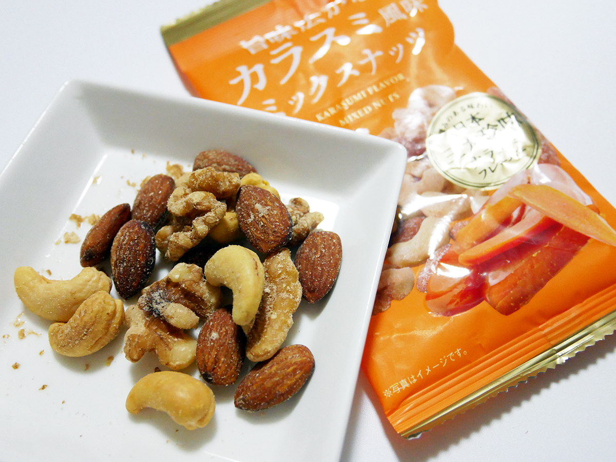 おやつ 日本酒や焼酎と合わせたい!旨味広がるカラスミ風味ミックスナッツ@ダイソー