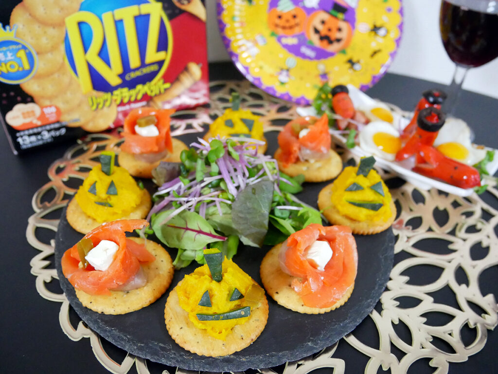 ナビスコ リッツの新商品<ブラックペッパー>に、チンしたカボチャマッシュを合わせ顔をつけたらハロウィン仕様のリッツパーティ!お好みでスモークサーモンリッツや赤ウインナー星人で飾り付けしよう♪